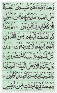 Transliteration: Waahidatan fa-izaa hum khaamidoon (29) Yaa hasratan 'alal 'ibaad; maa yaateehim mir Rasoolin illaa kaanoo bihee yastahzi 'oon (30) Alam yaraw kam ahlak naa qablahum minal qurooni annahum ilaihim laa yarji'oon (31) Wa in kullul lammaa jamee'ul-ladainaa muhdaroon (32) Wa Aayatul lahumul ardul maitatu ahyainaahaa wa akhrajnaa minhaa habban faminhu yaakuloon (33) Wa ja'alnaa feehaa jannaatim min nakheelinw